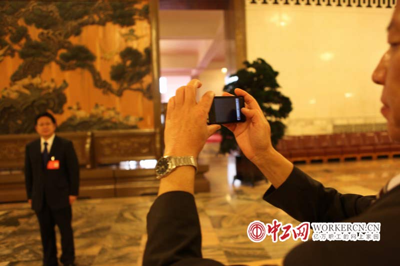 图为中国工会十六大一位参会代表在大会堂大厅,用自己随身携带的数码产品为代表拍照留念。 中工网摄影记者 姚星 摄