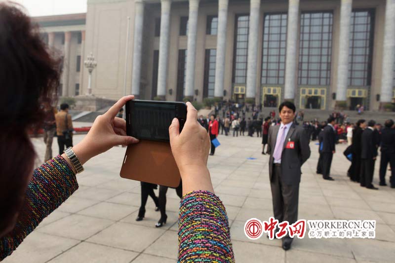 图为中国工会十六大一位参会代表在大会堂外,用自己随身携带的手机为代表留念。   中工网摄影记者  姚星  摄
