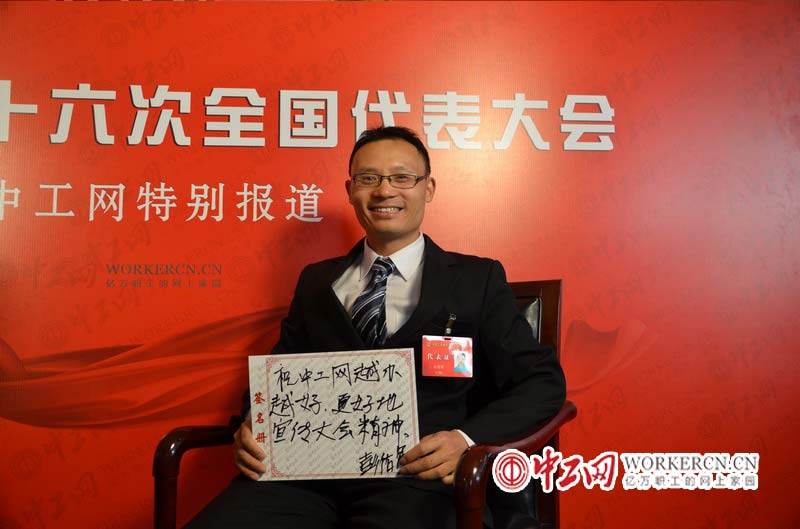 10月18日,中国工会第十六次全国代表大会在北京人民大会堂召开。为做好报道工作,中工网在京西宾馆大会新闻中心临时搭建演播室,为来自全国各地的一线基层代表进行一对一的访谈。图为南昌凯莱大饭店管事部经理、中国工会十六大代表彭佑军为此次大会及中工网写下的祝福。