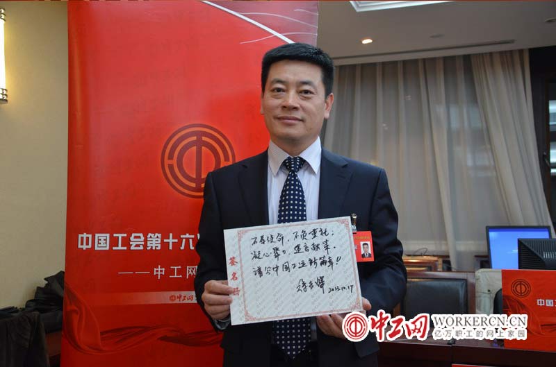 10月18日,中国工会第十六次全国代表大会在北京人民大会堂召开。为做好报道工作,中工网在京西宾馆大会新闻中心临时搭建演播室,为来自全国各地的一线基层代表进行一对一的访谈。图为辽宁大连软件园工会联合会主席、中国工会十六大代表徐世辉为此次大会及中工网写下的祝福。