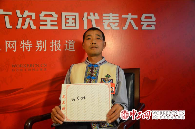 10月18日,中国工会第十六次全国代表大会在北京人民大会堂召开。为做好报道工作,中工网在京西宾馆大会新闻中心临时搭建演播室,为来自全国各地的一线基层代表进行一对一的访谈。图为四川兴文县华福集团公司采煤班班组长、中国工会十六大代表杨学林为此次大会及中工网写下的祝福。