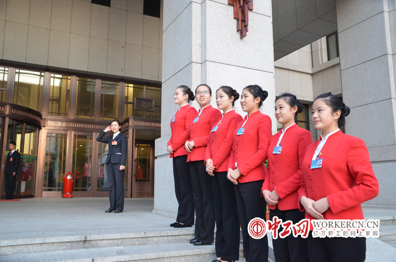 参与中国工会十六大的各地代表陆续抵京之际,各住地的服务员们也在用自己的“微笑”为代表们提供热情、周到的服务。图为京西宾馆服务员正在列队欢迎代 表入住。    中工网记者 秦笑语摄