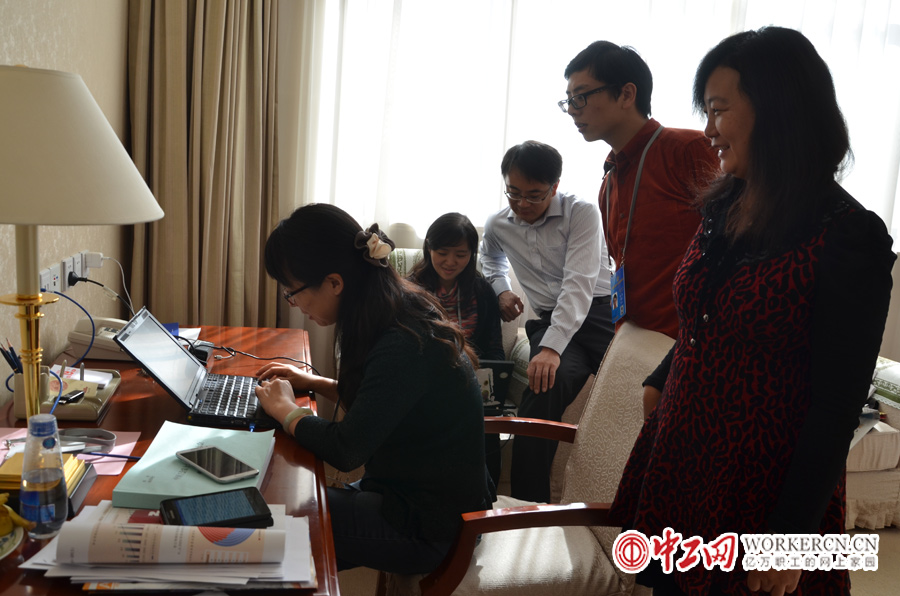 10月18日,中国工会第十六次全国代表大会在北京召开,来自中央和地方70余家媒体的百余名记者对中国工会十六大进行了全方位的报道。图为新华社工会十六大报道组正在紧张的工作。 (中工网记者 笑语摄)