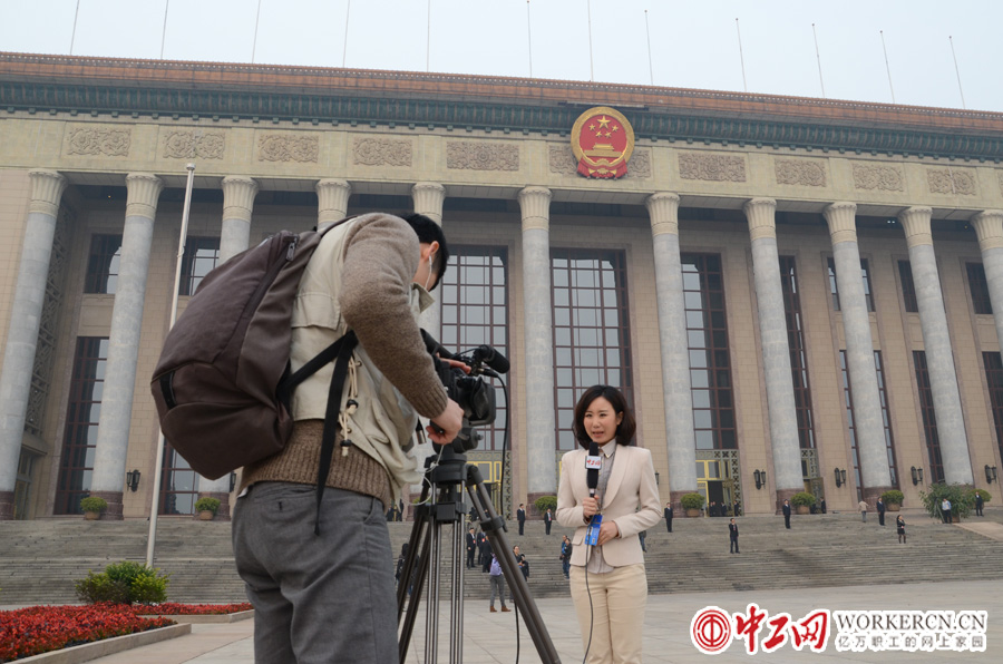 10月18日,中国工会第十六次全国代表大会在北京召开,来自中央和地方70余家媒体的百余名记者对中国工会十六大进行了全方位的报道。图为中工网记者在北京人民大会堂外亮相。 (中工网记者 笑语摄)