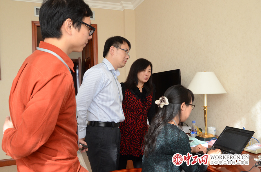 10月18日,中国工会第十六次全国代表大会在北京召开,来自中央和地方70余家媒体的百余名记者对中国工会十六大进行了全方位的报道。图为新华社工会十六大报道组正在紧张的工作。 (中工网记者 笑语摄)