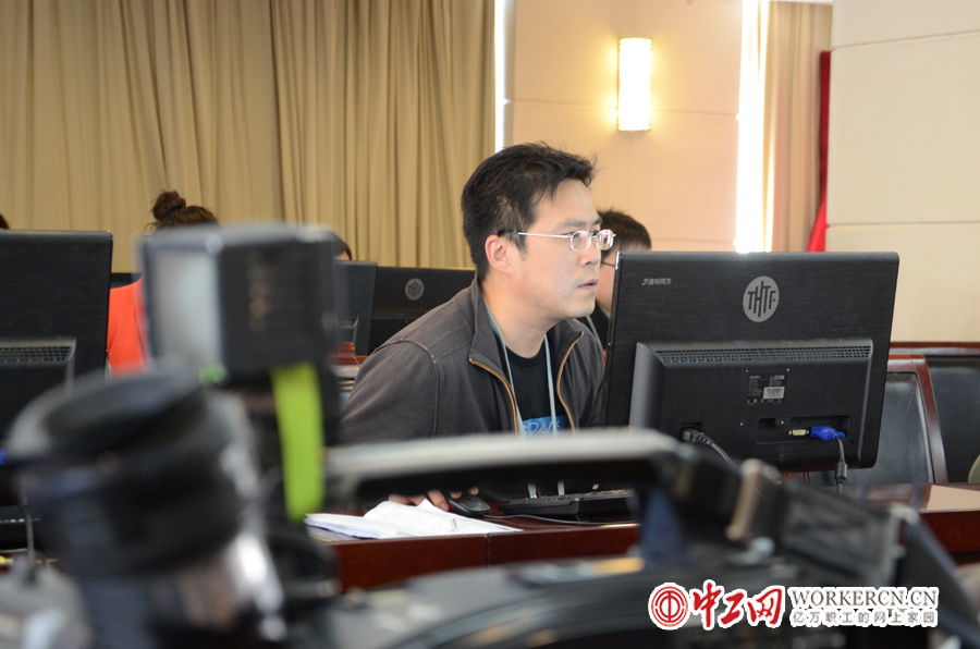 10月18日,中国工会第十六次全国代表大会在北京召开,来自中央和地方70余家媒体的百余名记者对中国工会十六大进行了全方位的报道。图为中央电视台记者在大会新闻中心查阅工会十六大资料。 (中工网记者 笑语摄)