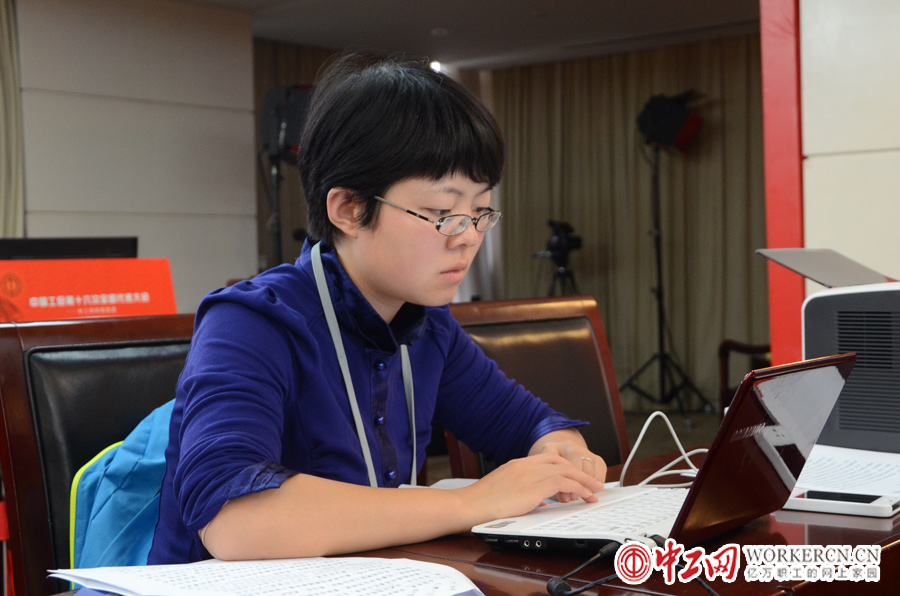 10月18日,中国工会第十六次全国代表大会在北京召开,来自中央和地方70余家媒体的百余名记者对中国工会十六大进行了全方位的报道。中国日报注重向国外受众介绍中国工会在实现、维护、发展职工权益方面的作为,图为中国日报记者在编稿。 (中工网记者 笑语摄)