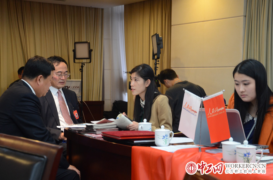 10月18日,中国工会第十六次全国代表大会在北京召开,来自中央和地方70余家媒体的百余名记者对中国工会十六大进行了全方位的报道。图为人民网记者在大会新闻中心采访与会代表。 (中工网记者 笑语摄)