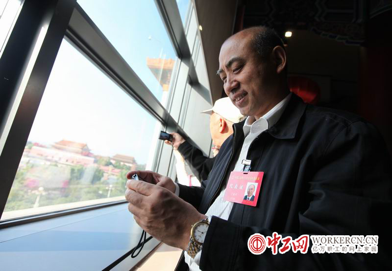 参观结束后,中国全聚德集团工会主席于嘉祥在国家博物馆的二层拍摄天安门,这更让他感受到我们要珍惜现在来之不易的生活。作为一家有着百年中华老字号企业的工会主席,同时也是一名中国工会十六大代表,他觉得身上的责任更大了,要更好的坚持科学发展,践行中国服务,尤其明年是全聚德集团成立150周年,在很多代人共同努力下能够将这个中国品牌做的更响。(中工网记者马杨灵 摄)