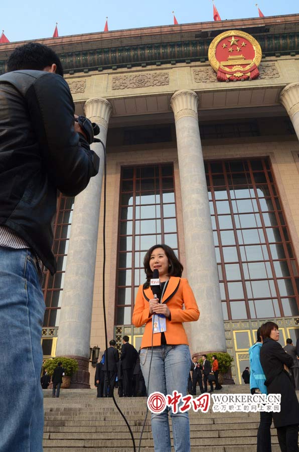 中国工会第十六次全国代表大会于10月22日上午在京闭幕。图为中工网记者在北京人民大会堂外进行闭幕会的报道。   (中工网记者  笑语摄)