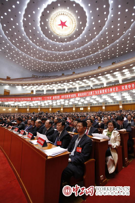大会宣布了当选的中华全国总工会第十六届执行委员会主席、副主席、主席团委员、书记处书记名单和经费审查委员会主任、副主任、常委名单;表决通过了《关于中华全国总工会第十五届执行委员会报告的决议》(草案)、《关于<中国工会章程(修正案)>的决议》(草案)、《关于中华全国总工会第十五届执行委员会财务工作报告的决议》(草案)和《关于中华全国总工会第十五届经费审查委员会工作报告的决议》(草案)。 图为大会现场。中工网记者韩靖摄