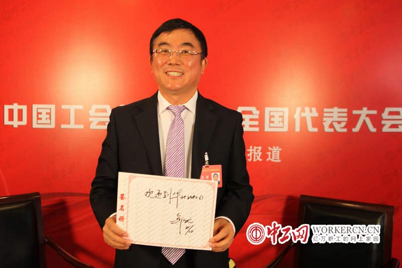 10月18日,中国工会第十六次全国代表大会在北京人民大会堂召开。为做好报道工作,中工网在京西宾馆大会新闻中心临时搭建演播室,为来自全国各地的一线基层代表进行一对一的访谈。图为中国工会十六大代表,中石油华北油田党委副书记、纪委书记、工会主席金海龙为此次大会及中工网写下的祝福。 (中工网记者 宋晓俐摄)