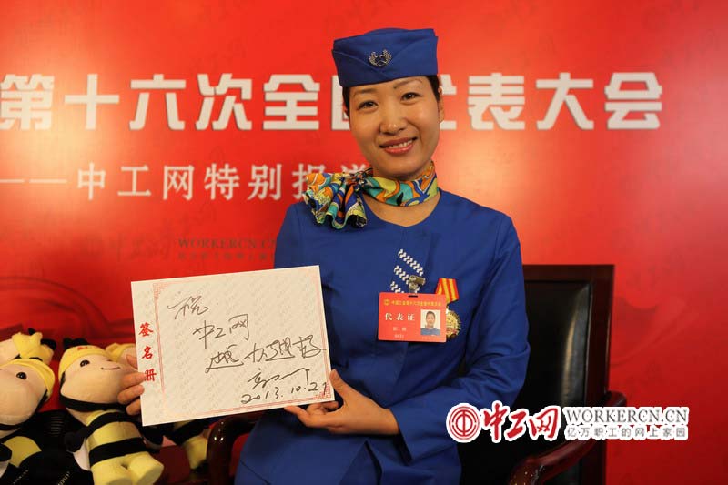 10月18日,中国工会第十六次全国代表大会在北京人民大会堂召开。为做好报道工作,中工网在京西宾馆大会新闻中心临时搭建演播室,为来自全国各地的一线基层代表进行一对一的访谈。图为中国工会十六大代表,河北保定汽车总站郭娜班班长郭娜为此次大会及中工网写下的祝福。 (中工网记者 宋晓俐摄)