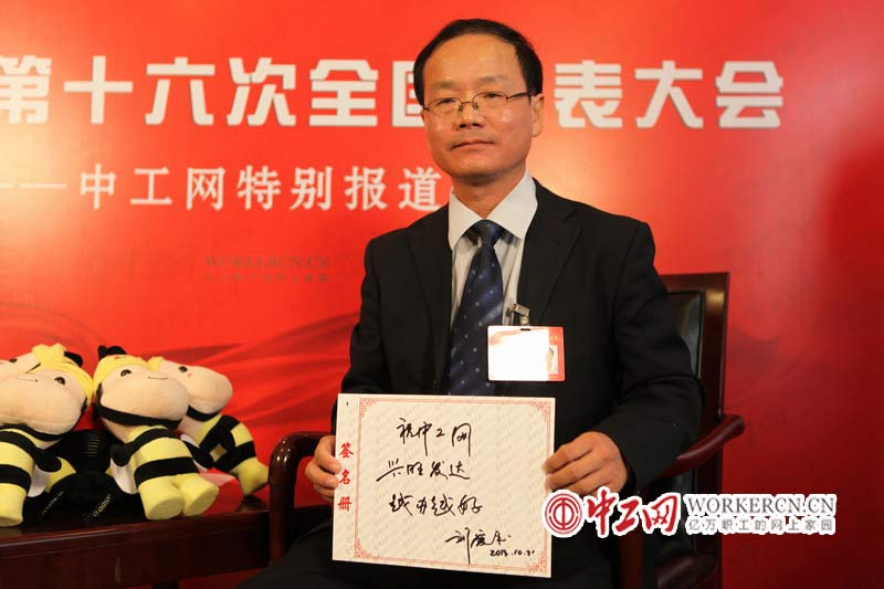10月18日,中国工会第十六次全国代表大会在北京人民大会堂召开。为做好报道工作,中工网在京西宾馆大会新闻中心临时搭建演播室,为来自全国各地的一线基层代表进行一对一的访谈。图为中国工会十六大代表,湖北省随州市总工会党组书记常务副主席刘爱书为此次大会及中工网写下的祝福。 (中工网记者 宋晓俐摄)