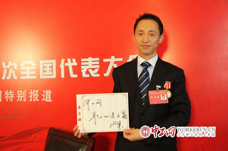 10月18日,中国工会第十六次全国代表大会在北京人民大会堂召开。为做好报道工作,中工网在京西宾馆大会新闻中心临时搭建演播室,为来自全国各地的一线基层代表进行一对一的访谈。图为中国工会十六大代表,北京基业达电气有限公司刘军为此次大会及中工网写下的祝福。 (中工网记者 宋晓俐摄)