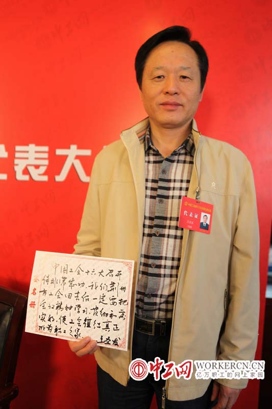 10月18日,中国工会第十六次全国代表大会在北京人民大会堂召开。为做好报道工作,中工网在京西宾馆大会新闻中心临时搭建演播室,为来自全国各地的一线基层代表进行一对一的访谈。图为中国工会十六大代表,湖北荆州市总党组书记、常务副主席王圣发为此次大会及中工网写下的祝福。 (中工网记者 宋晓俐摄)