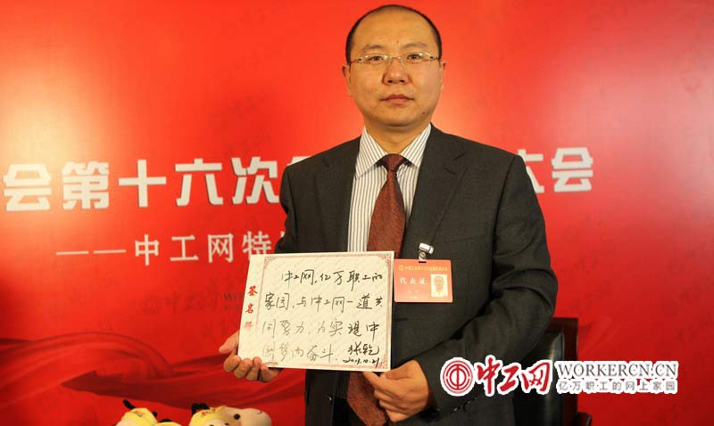 10月18日,中国工会第十六次全国代表大会在北京人民大会堂召开。为做好报道工作,中工网在京西宾馆大会新闻中心临时搭建演播室,为来自全国各地的一线基层代表进行一对一的访谈。图为中国工会十六大代表,英利集团工会主席张乾为此次大会及中工网写下的祝福。 (中工网记者 宋晓俐摄)