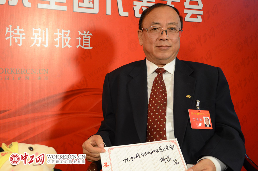 10月18日,中国工会第十六次全国代表大会在北京人民大会堂召开。为做好报道工作,中工网在京西宾馆大会新闻中心临时搭建演播室,为来自全国各地的一线基层代表进行一对一的访谈。图为中国工会十六大代表、内蒙古自治区第一机械制造集团有限公司工会主席刘良为此次大会及中工网写下的祝福。 (中工网记者 笑语摄)