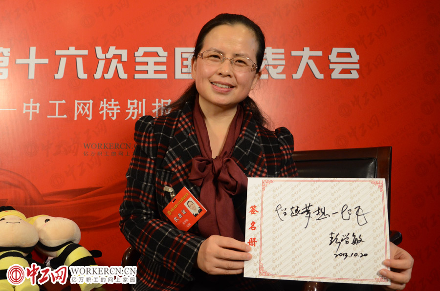 10月18日,中国工会第十六次全国代表大会在北京人民大会堂召开。为做好报道工作,中工网在京西宾馆大会新闻中心临时搭建演播室,为来自全国各地的一线基层代表进行一对一的访谈。图为中国工会十六大代表、河南省郑州宇通客车股份有限公司党委副书记、工会主席彭学敏为此次大会及中工网写下的祝福。 (中工网记者 笑语摄)