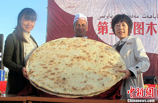 10月25日,“第三届西域美食旅游文化节”在新疆图木舒克市开幕。图为产于图木舒克的刀郎馕,该馕直径约一米,又称刀郎皮萨,馕中间是肉馅。