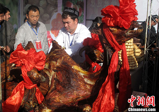 10月25日,“第三届西域美食旅游文化节”在新疆图木舒克市开幕。图为产于图木舒克的刀郎馕,该馕直径约一米,又称刀郎皮萨,馕中间是肉馅。