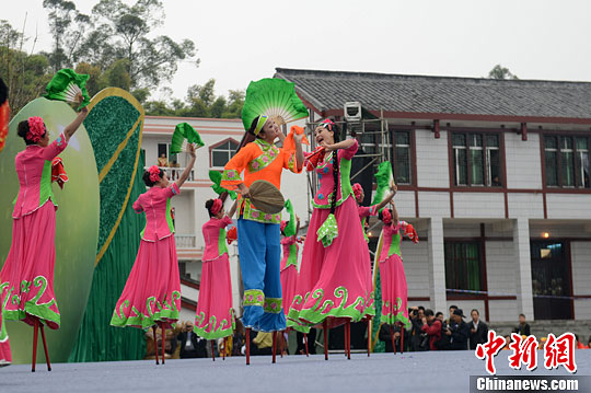 10月27日,第三届全国新农村文化艺术展演首场文艺巡演在四川省达州市举行。图为来自东北的节目——“踩高跷”。中新社发 张浪 摄