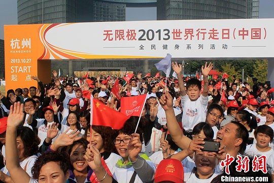 10月27日,万余名行走爱好者手中挥着健康小旗帜、喊着口号,汇聚在浙江杭州市民中心广场,参与“无限极2013世界行走日”活动,他们沿着钱塘江畔一路行进7公里,呼吁更多民众加入全民健身的行列。中新社发 邵思翊 摄