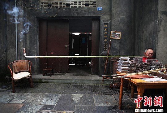 10月27日,成都宽窄巷子内,一位老人抽起三米多长的烟斗,惬意的神情令游客瞠目。 中新社发 泱波 摄