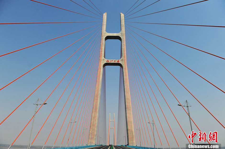 10月28日,江西九江长江二桥将正式建成通车,制约赣鄂两省的过江瓶颈将全面打通。自2009年9月开工建设以来,九江长江二桥一直备受关注。该桥地处赣、鄂、皖三省交界处,是福银高速通过长江的重要咽喉,也是连接赣、鄂、皖三省以及中部地区各省份的重要过江通道。该桥是江西省建设的第一座具有世界领先水平的跨长江高速公路桥梁,大桥长8462米,主跨跨径达818米,目前居世界斜拉桥第7位、国内第4位。该桥主塔高达240多米,相当于80多层高楼。图为10月25日,开通前的九江长江二桥。刘占昆 摄