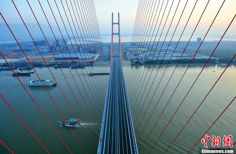 10月28日,江西九江长江二桥将正式建成通车,制约赣鄂两省的过江瓶颈将全面打通。自2009年9月开工建设以来,九江长江二桥一直备受关注。该桥地处赣、鄂、皖三省交界处,是福银高速通过长江的重要咽喉,也是连接赣、鄂、皖三省以及中部地区各省份的重要过江通道。该桥是江西省建设的第一座具有世界领先水平的跨长江高速公路桥梁,大桥长8462米,主跨跨径达818米,目前居世界斜拉桥第7位、国内第4位。该桥主塔高达240多米,相当于80多层高楼。图为大桥气势恢弘,外观壮美,犹如一条长龙横贯赣鄂两省。刘占昆 摄