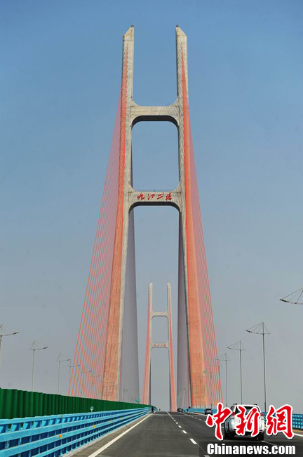 10月28日,江西九江长江二桥将正式建成通车,制约赣鄂两省的过江瓶颈将全面打通。自2009年9月开工建设以来,九江长江二桥一直备受关注。该桥地处赣、鄂、皖三省交界处,是福银高速通过长江的重要咽喉,也是连接赣、鄂、皖三省以及中部地区各省份的重要过江通道。该桥是江西省建设的第一座具有世界领先水平的跨长江高速公路桥梁,大桥长8462米,主跨跨径达818米,目前居世界斜拉桥第7位、国内第4位。该桥主塔高达240多米,相当于80多层高楼。图为10月25日,开通前的九江长江二桥。刘占昆 摄
