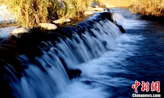 深秋的甘肃张掖国家湿地公园里,芦苇金黄,湖水清澈,新建的楼房倒映在湖水中,彰显出湿地之城的魅力。在芦苇深处,有几处大小不一的瀑布,它们给湿地增添了不一样的风景。在这里,可以看到秋水长流,秋波浩淼的壮观场景。陈礼 摄