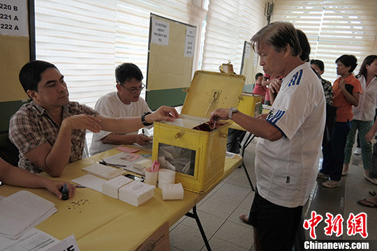 10月28日,菲律宾首都大马尼拉地区马卡蒂市达斯马里纳斯村居民参加“描笼涯”(村)选举投票。图为选民在工作人员帮助下把选票投入票箱。中新社发 张明 摄