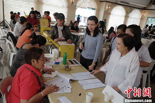 10月28日,菲律宾首都大马尼拉地区马卡蒂市达斯马里纳斯村居民参加“描笼涯”(村)选举投票。图为选民向工作人员领取选票。中新社发 张明 摄