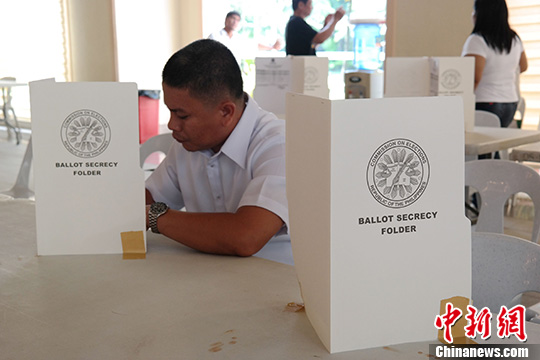 10月28日,菲律宾首都大马尼拉地区马卡蒂市达斯马里纳斯村居民参加“描笼涯”(村)选举投票。图为选民在一张折页的遮挡下写票。中新社发 张明 摄