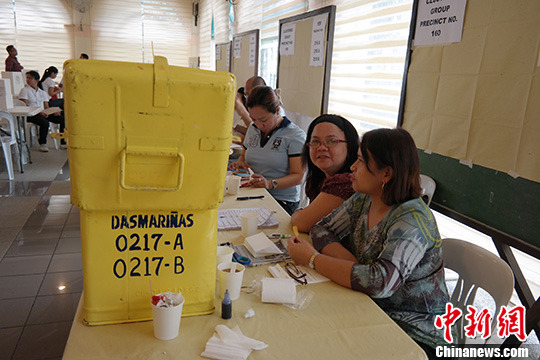 10月28日,菲律宾首都大马尼拉地区马卡蒂市达斯马里纳斯村居民参加“描笼涯”(村)选举投票。图为选举工作人员在投票箱等待选民。中新社发 张明 摄