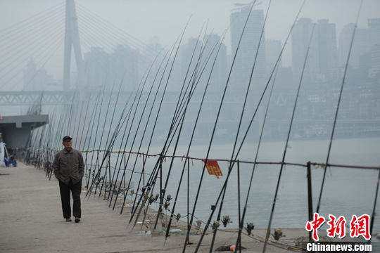 10月28日,重庆不少钓鱼爱好者正在嘉陵江边钓鱼。重庆北滨路嘉陵江边,市民上千鱼竿绑在护栏上进行垂钓,他们密密麻麻的鱼线好似在“网鱼”而不是钓鱼。图为市民正在钓鱼。陈超 摄