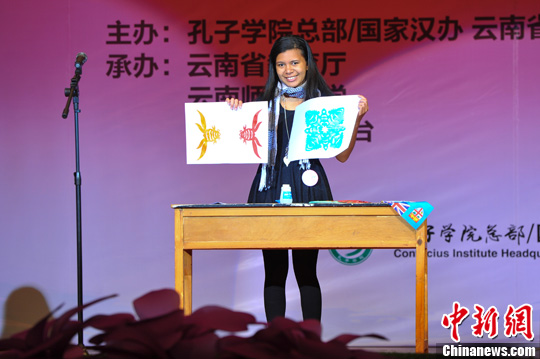 图为参赛选手现场做剪纸。中新社发 任东 摄