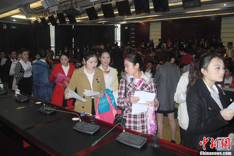 10月28日,南航贵州公司在贵阳举行2013年空中乘务员、空中安全员招聘。600余名“帅哥”、“美女”参与应聘,现场“人满为患”,场面火爆。据了解此次应聘的大学生多为“90”后。图为应聘者在现场等候。中新社发 严光辉 摄