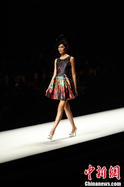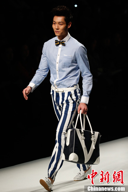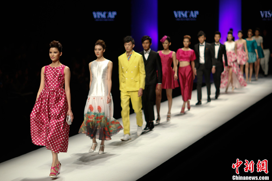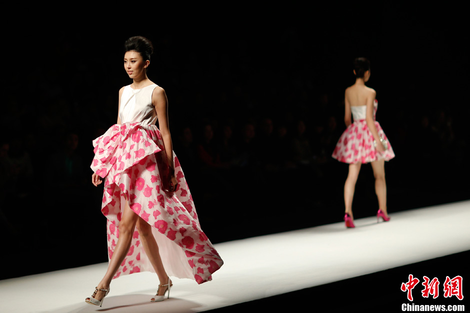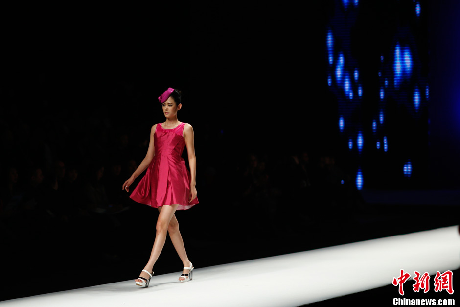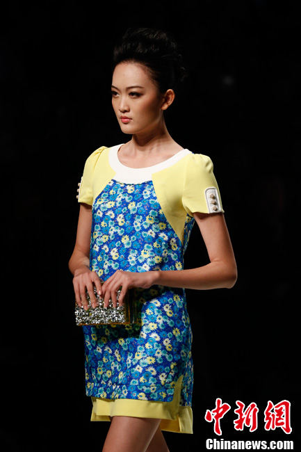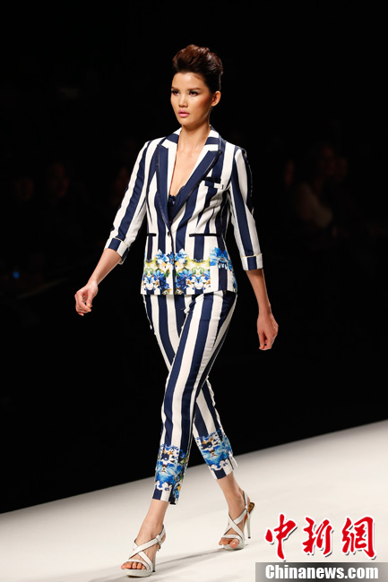 10月28日,模特在中国国际时装周(2014春夏系列)上展示设计师袁冰的设计的时装。本次时装发布会作品主题为“Malaga的海边派对”,既运用最具创意的潮流元素,又致力于为都市新贵量体裁衣。中新社发 盛佳鹏 摄