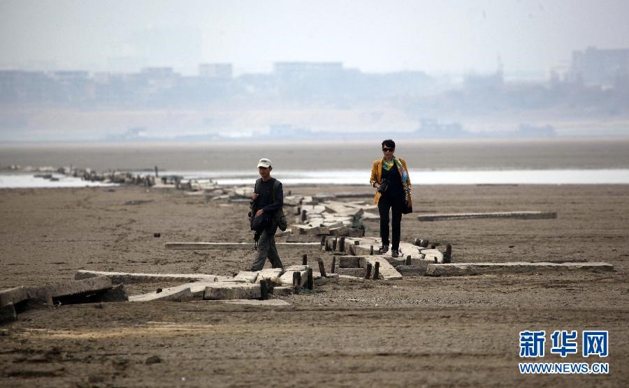 10月28日,游人行走在露出水面的鄱阳湖底古石桥上。日前,由于鄱阳湖水位下降至枯水位,一座石桥露出水面。该石桥位于鄱阳湖江西都昌县多宝乡附近的鄱阳湖湖床上,连接都昌县多宝乡蒋公岭和星子县县城,历史上曾是两县沿湖群众往来的交通要道。据都昌县文物保护部门勘测,石桥总长2657米,桥身石材全部采用花岗石,桥面宽0.82米,有900余个孔,故称“千眼桥”。据了解,该桥修建于明代崇祯年间,被称为“全国最长的湖中石桥”,是江西省重点保护文物。新华社发 傅建斌 摄