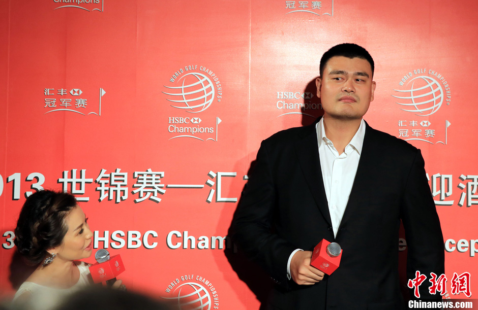 10月29日晚,2013世锦赛——汇丰冠军赛欢迎酒会在上海举行,吸引姚明、李小鹏以及张静初和佘诗曼等体坛精英和演艺明星助阵该高尔夫盛会。图为姚明一脸无奈神情,因又被问如何培养女儿打篮球。中新社发 潘索菲 摄
