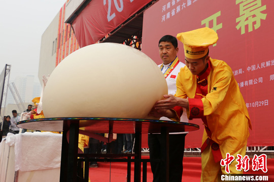 在气球上切肉丝、吹面气球、拉龙须面,等等,在精彩绝伦的厨艺绝技一一表演外,还有直径达3.15米、深0.7米的天下第一大锅烩面惊艳亮相。10月29日,首届中原美食节在郑州中原国际博览中心开幕。图为厨师现场展示吹面气球。门杰丹 摄