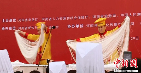 图为厨师现场展示拉龙须面。门杰丹 摄
