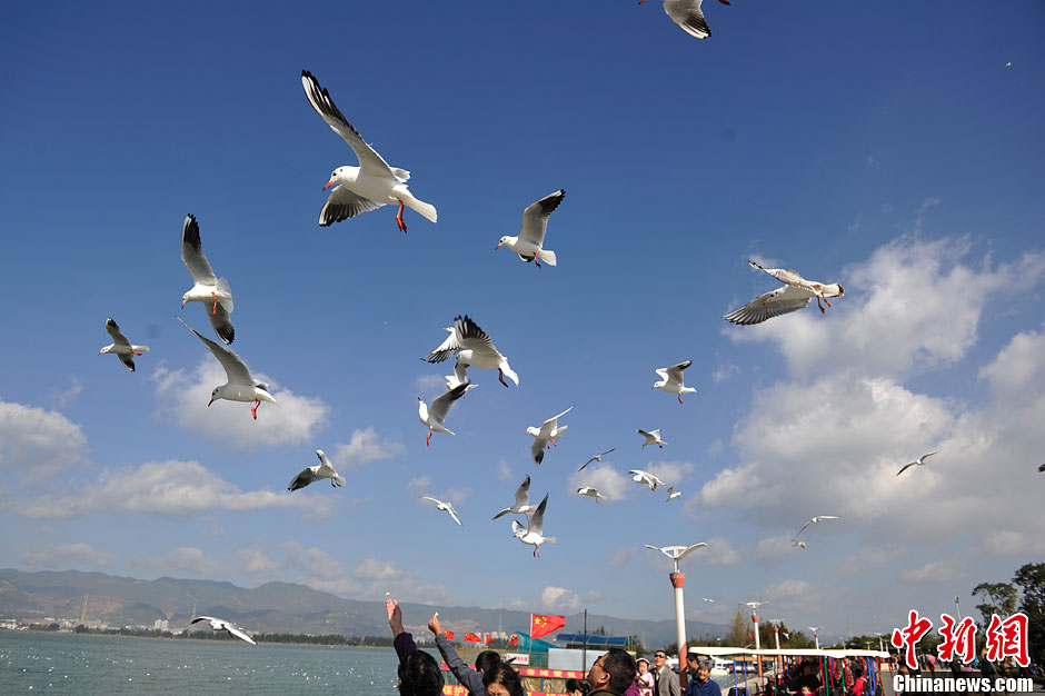 10月30日,昆明天气放晴,市民来到海埂大坝观鸥。近日,红嘴鸥再次从西伯利亚飞抵昆明越冬,鸥翔人欢、鸥鸣人乐。中新社发 刘冉阳 摄