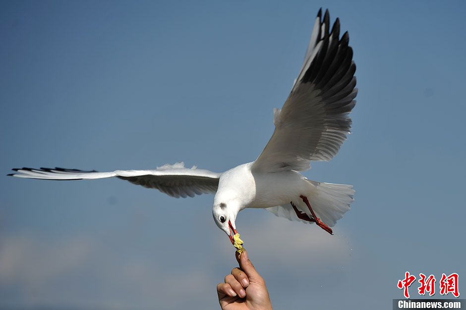 10月30日,一只红嘴鸥从游客手中取食。近日,红嘴鸥再次从西伯利亚飞抵昆明越冬,鸥翔人欢、鸥鸣人乐。中新社发 刘冉阳 摄