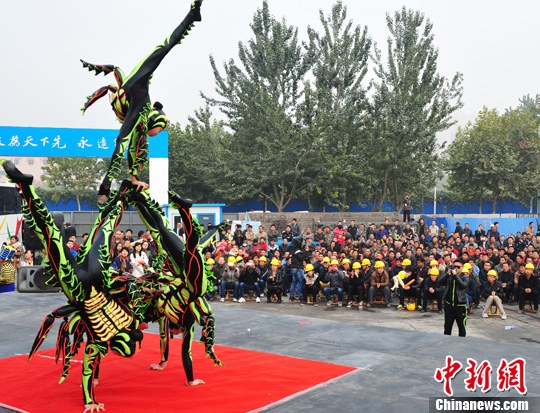 吴桥杂技节走进工地 杂技艺术家与农民工开心互动