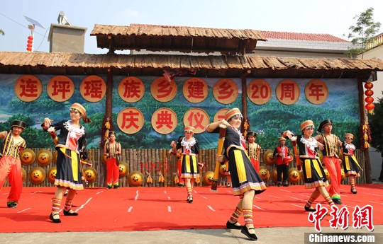 10月31日,湖南省资兴市连坪瑶族乡迎来20周岁生日,上百名瑶族同胞穿着鲜艳的民族服装载歌载舞,喜庆属于自己的节日。图为庆典现场。刘柱 摄
