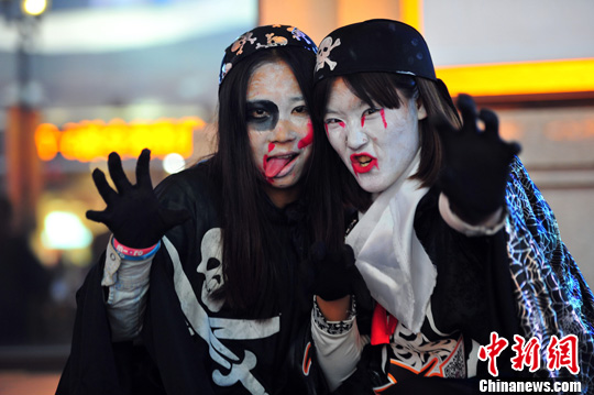 10月31日,万圣节前夜,沈阳许多年轻人扮“鬼”走上街头营造恐怖又欢乐的气氛。中新社发 于海洋 摄