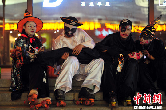 图为沈阳许多年轻人扮“鬼”走上街头营造恐怖又欢乐的气氛。中新社发 于海洋 摄